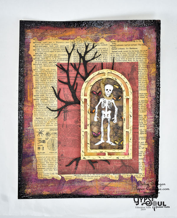 Read the rest of this entrySo many elements go into this mixed media piece–layered background paper, mica stained glass windows, National Geographic background paper, an old dictionary page and even a tiny little noose.