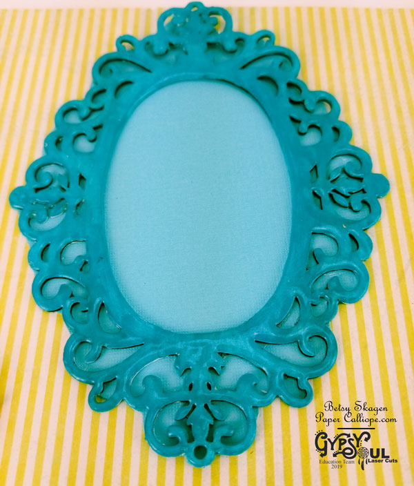 For the Flourished Frame page. cut a piece of teal cardstock to fit behind the frame. Glue only the bottom edge of the frame to the cardstock so that a picture can be slid into place.
