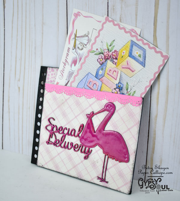 The book will feature all sorts of pockets, fold-outs and teeny little spaces to store precious mementos and tags to record different milestones and memories. I am using some of Gypsy Soul’s wonderful chipboard to add some fun elements.