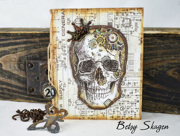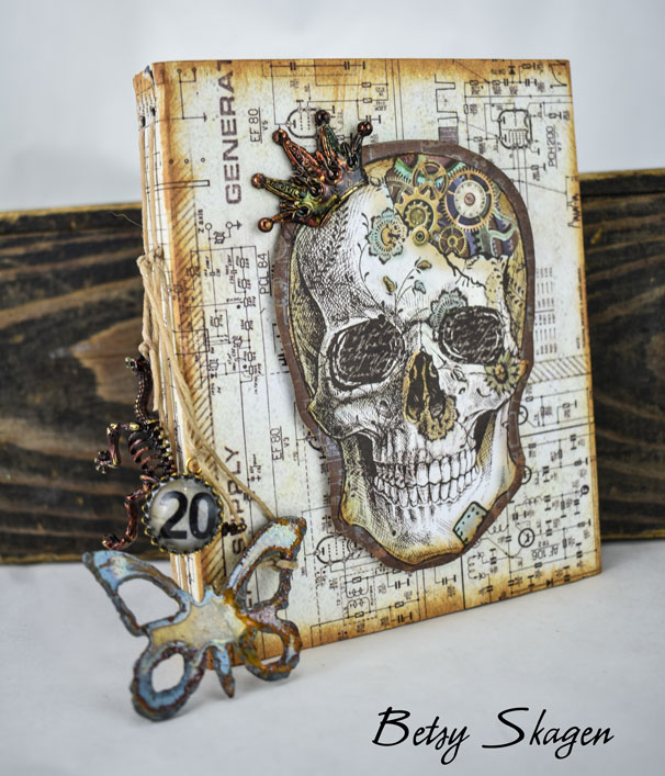 Layer different elements onto the back cover. In my case I cut out a skeleton and layered it upon some steampunk paper and added a metal crown that I had altered with alcohol ink. I then used placed it on the back cover with adhesive foam to give it extra dimension.