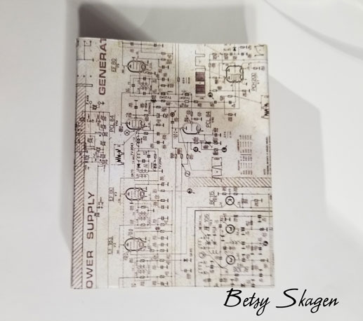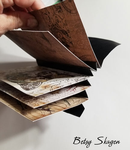 Cut 3 1/4″ x 5″ pages of decorative cardstock to make your pages. Cut a 5″ x 451/2″ strip of black Tyvek and score it every 1/4 inch to create your binding. Fold along the scores and adhere a page to each fold. Cut off the excess Tyvek.