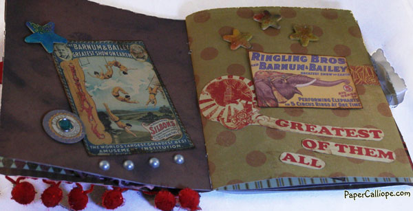 Altered-art-circus-box-book-page-3-4-web Published March 14, 2014 at 600 × 307 in Graphic 45 Design Team 2014 Audition Pages 3 & 4 of Altered Art Circus Box Hidden Book