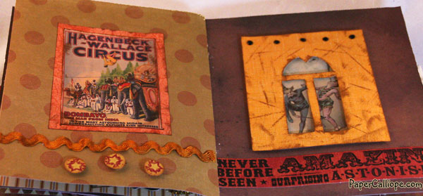 Altered-art-circus-box-book-page-7-8-by Paper Calliope Published March 14, 2014 at 600 × 279 in Graphic 45 Design Team 2014 Audition Pages 7 & 8 of Altered Art Circus Box Hidden Book