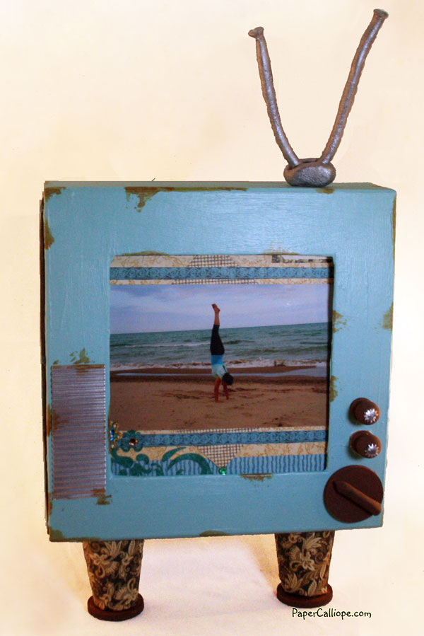 An Altered art and mixed media retro TV frame and shadow box created from a cardboard box by Paper Calliope