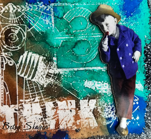 To make the piece, I began by stamping the Inventor’s Mother stamp with clear embossing ink onto white cardstock, covering it with Glistening Glass Molten Dimensions and activating with a heat gun.