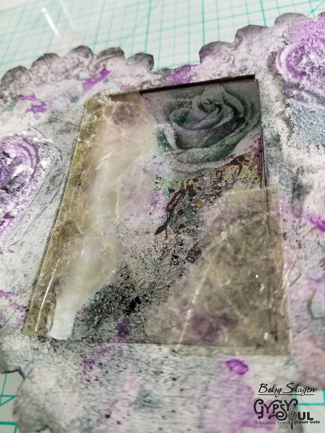 While the frame and paper clip cooled (be very careful when heating any metal with a heat gun!), I glued thin sheets of broken mica over the top of the niche.