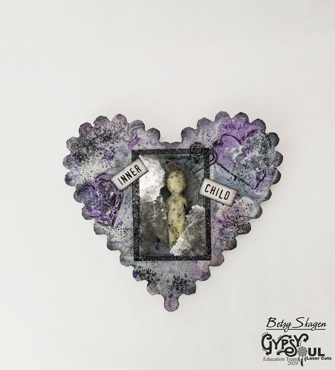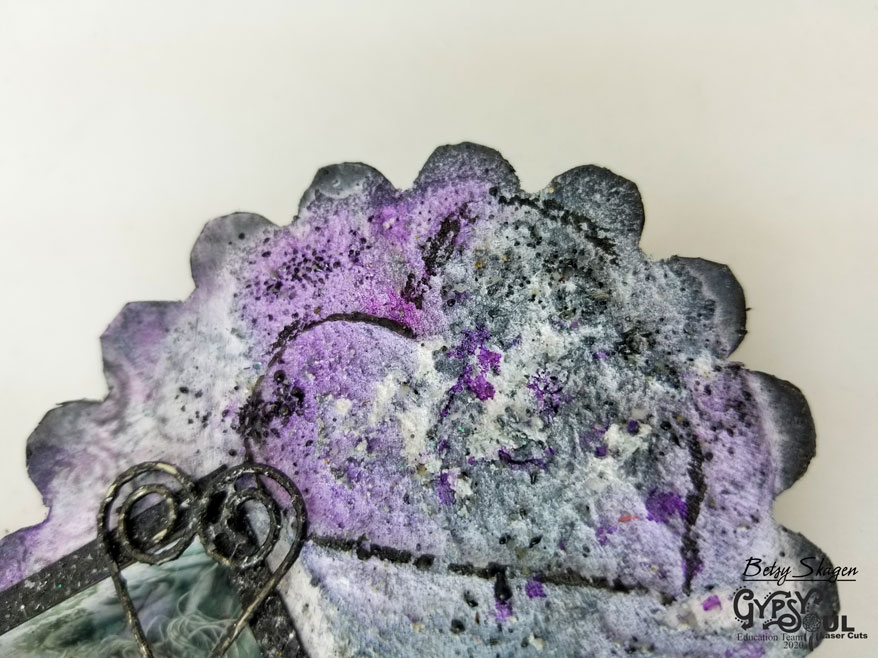 Next, I applied Distress Grit Paste, pressed heart stamps into the paste and dried with a heat gun. I darkened the edges of the heart with black ink and then sprayed everything with purple and black ink sprays. After the ink dried, I applied embossing ink, sprinkled Rocky Road Baked Texture onto the surface and activated with heat gun.
