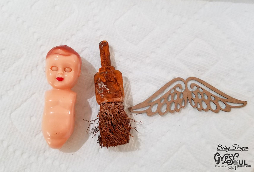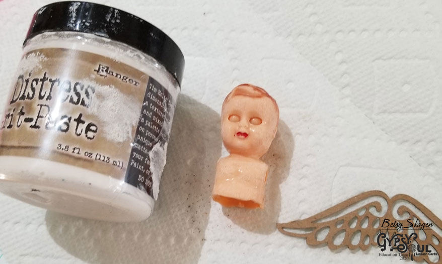 Next I painted applied Distress Grit-Paste to both Poor Little Baby and the Steampunk Wings and let dry.