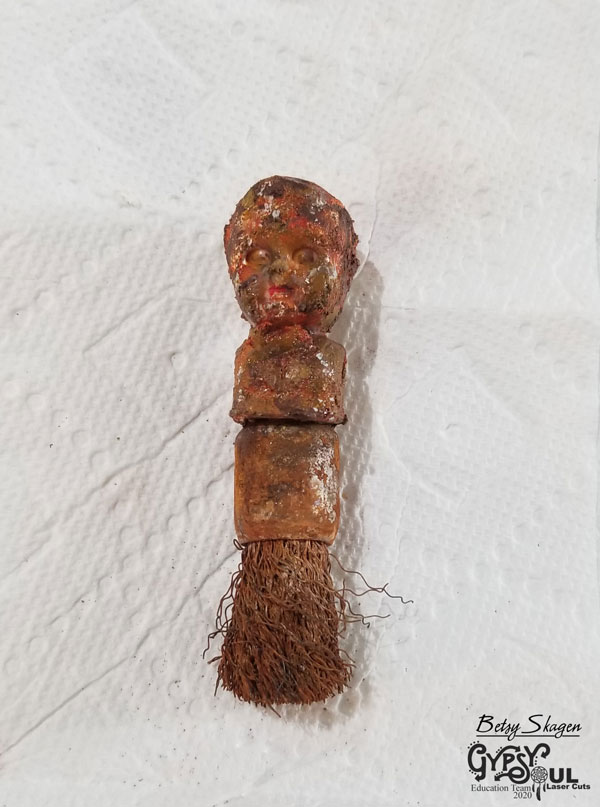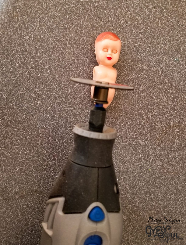 The next part of the project is a little morbid. I had to saw Poor Little Baby with a Dremel and then give her a brisk sanding. Luckily, she was very brave and didn’t cry once. If you do this, don’t use a heat gun or your baby will suddenly develop a deformed head.