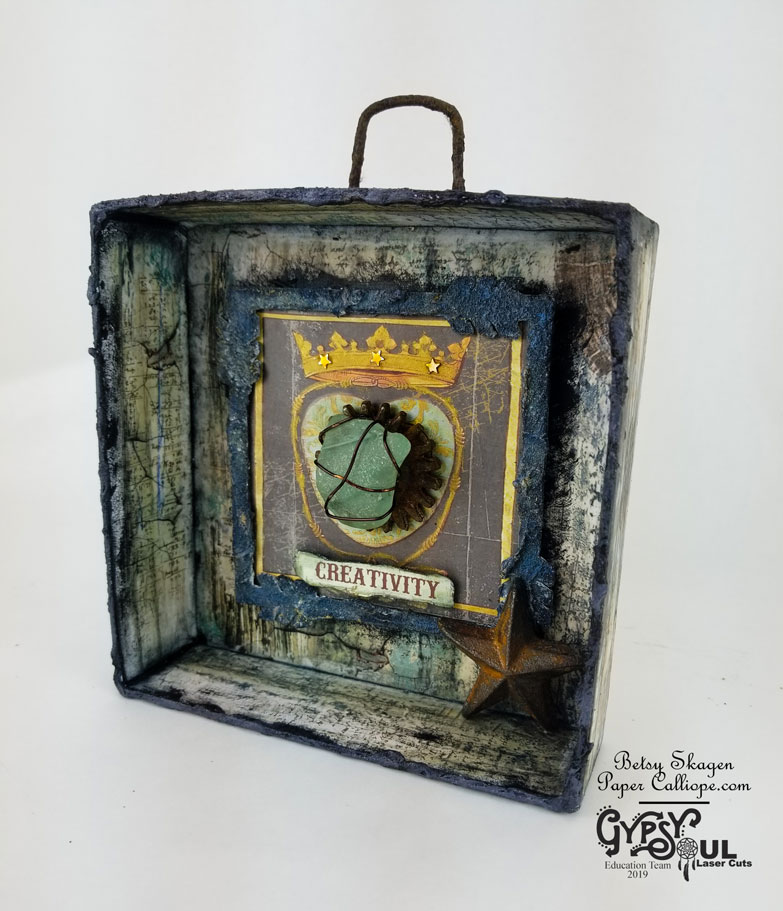 Some of my favorite found objects–a piece of lake glass, and old rusty wire and a rusty star–make up this new mixed media piece titled “Creativity”.